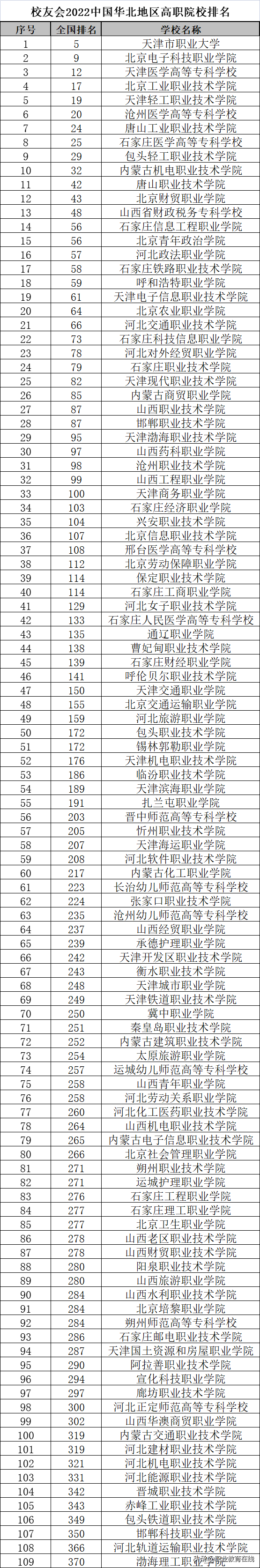 2022年华北地区的200所高职高专中有109所提交了资料,参与了校友会排名,具体排名如下: