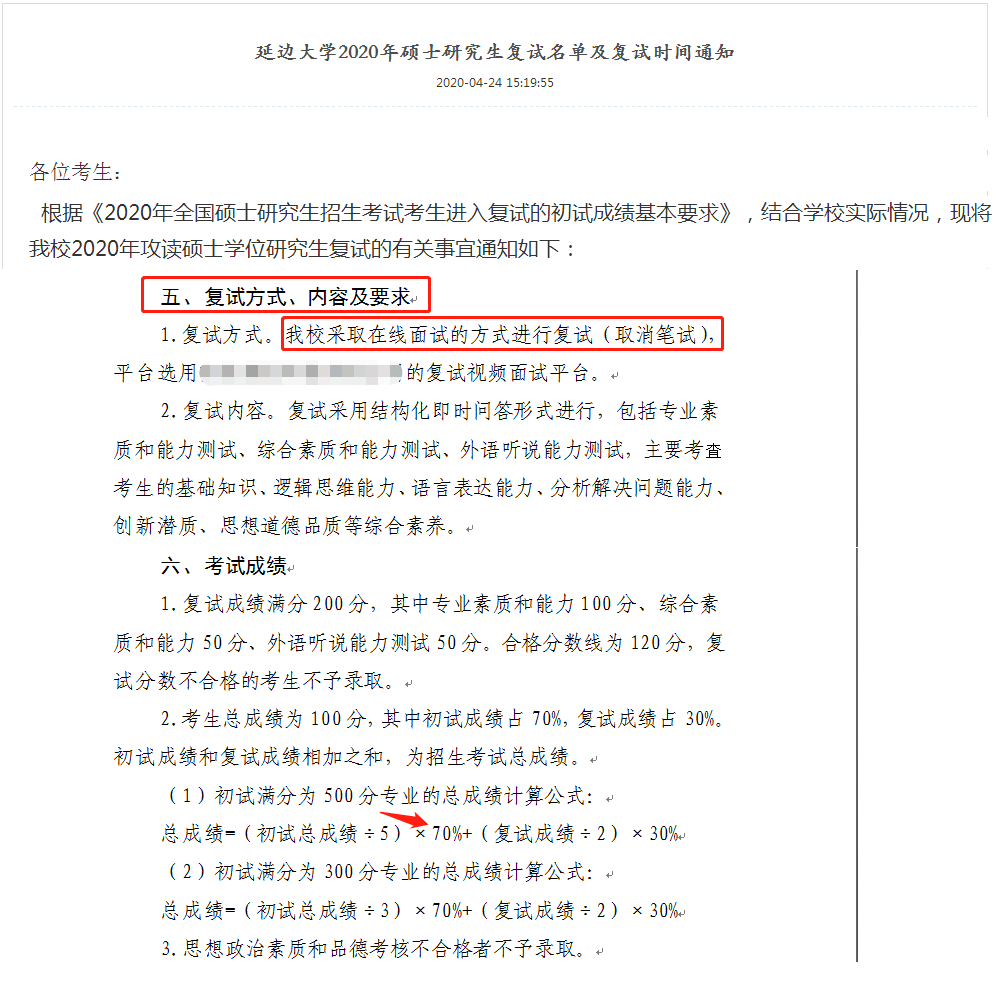 ”在线面试“、”复试取消笔试”、“初试成绩占比70%”,这是今年延边大学复试的亮点。