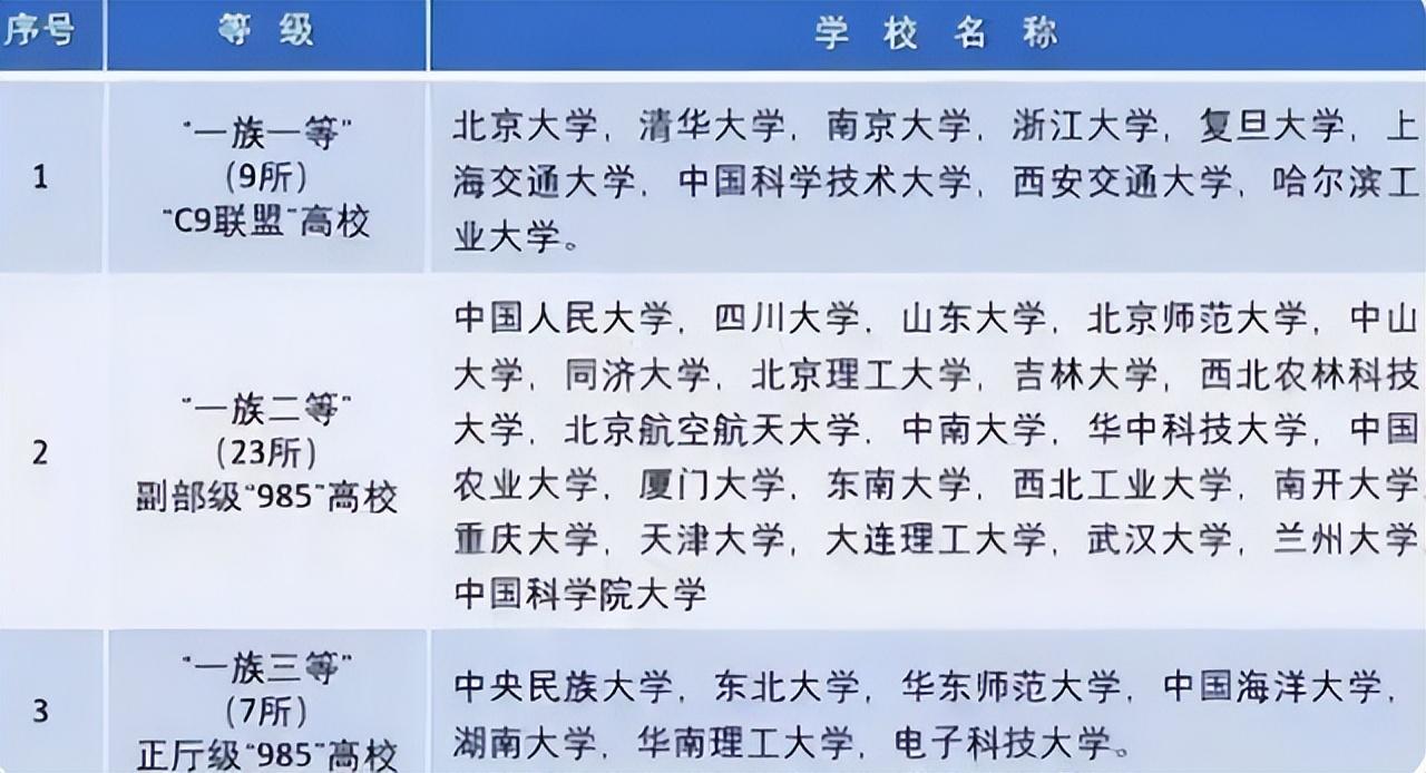 第三段位的高校是“一族三等”,7所高校均为正厅级985大学,这些大学的王牌专业在全国颇有名气,仅仅略逊于第二段位的高校。