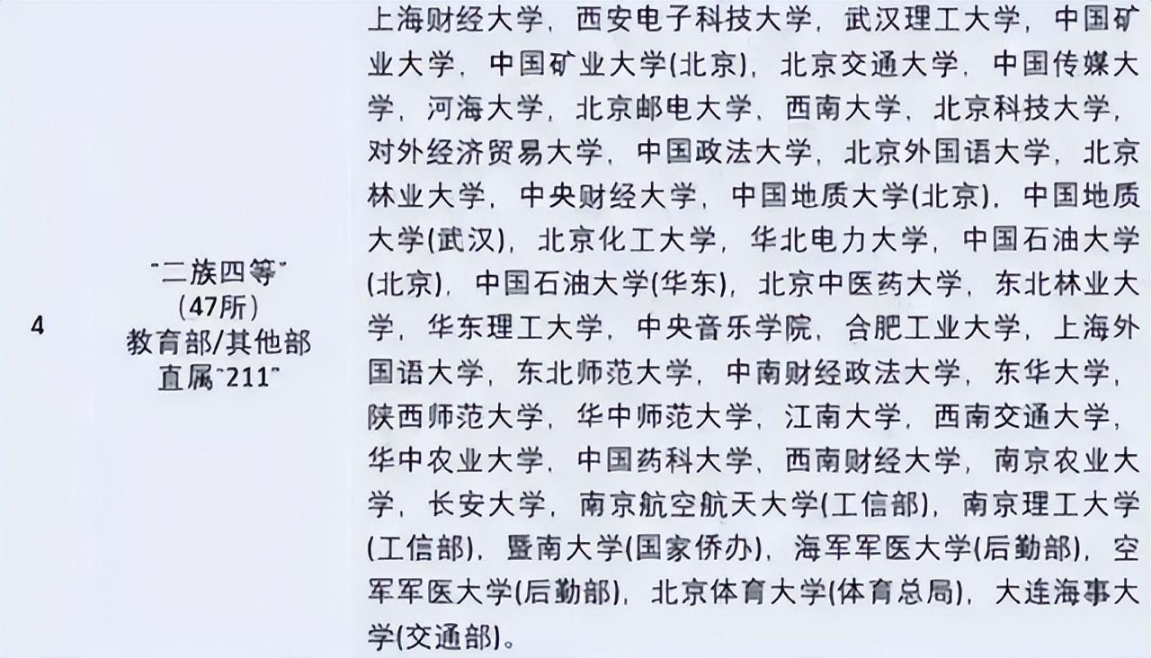 第四段位的大学叫“二族四等”,由47所教育部直属与其他部门直属211大学组成,这些高校的录取分数线也不低,基本上学霸级的学生都集中在了前四个等级。