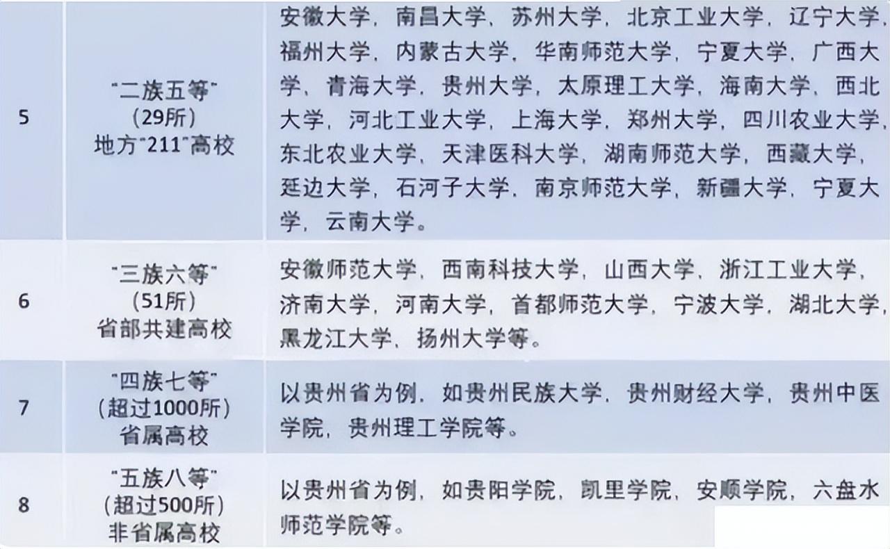 第六段位的大学是“三族六等”,有51所省部共建高校,第七段位的大学是“四族七等”,包括1000多所以上的省属大学;第八段位的大学是“五族八等”,500所以上的非省属高校。