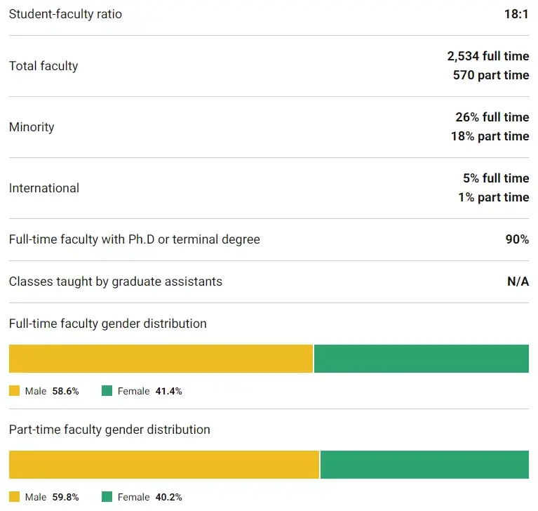 德克萨斯大学奥斯汀分校的学生和教师比例为18:1,学校有37.4%的班级学生人数少于20。德克萨斯大学奥斯汀分校最受欢迎的专业包括:工程学、社会科学、商业/管理/营销和相关支持服务、传播/新闻学和相关程序,以及生物与生物医学科学。大一新生的平均留任率是学生满意度的指标,为95%。