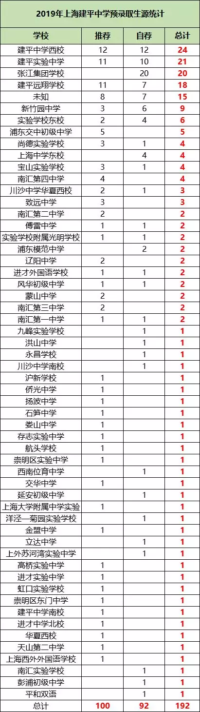 建平西校、建平远翔、建平实验这三所初中与建平同属一个集团,占了建平中学自招的29%的生源。另有两所非常有实力的学校——张江集团学校、新竹园中学在建平中学的自招中录取了比较多的学生。