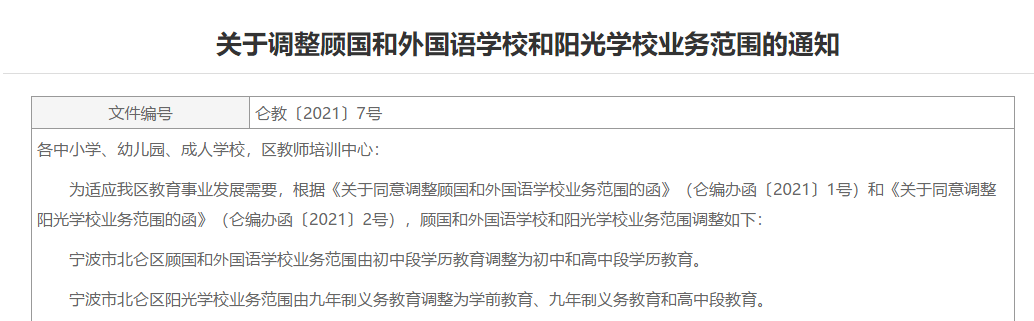 日前,北仑区人民政府网公开了《关于调整顾国和外国语学校和阳光学校业务范围的通知》。