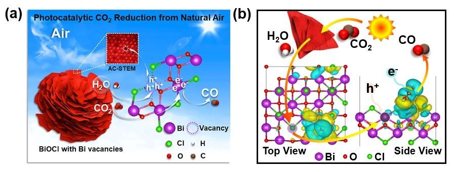 2021年11月,南京大学固体微结构物理国家重点实验室、物理学院、环境材料与可再生能源研究中心周勇教授/邹志刚院士团队设计出一种富含铋空位的全{001}面暴露的自组装玫瑰状BiOCl材料(简称VBOC),研究了引入的金属阳离子空位对光生空穴的吸引作用,证实了VBOC的强吸附能力,这种能力是进一步实现在空气中有效进行温室气体价值转换的重要保障,有助于高效实现碳达峰和碳中和目标。