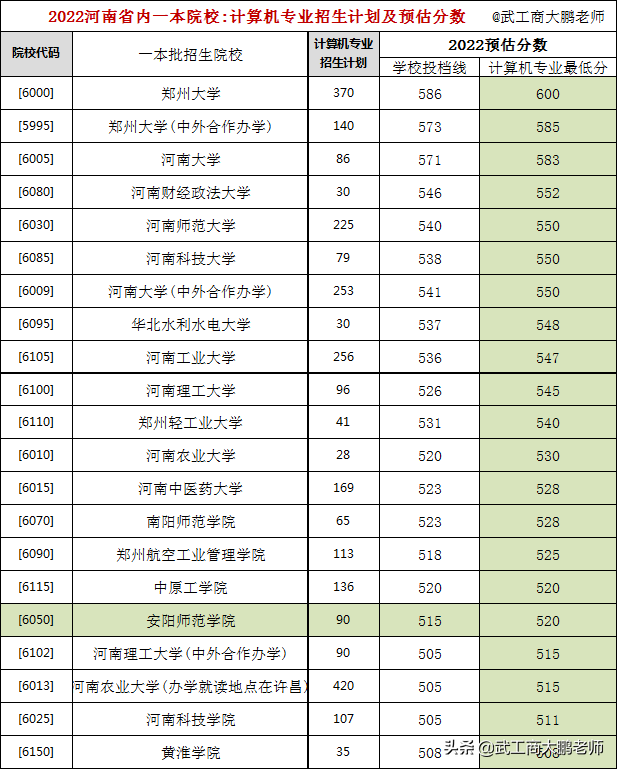 因为热门,所以计算机专业录取分数一般都比学校的投档线高出不少。大鹏老师根据对省内高校的了解及计算机学科实力,做出以下预估分析: