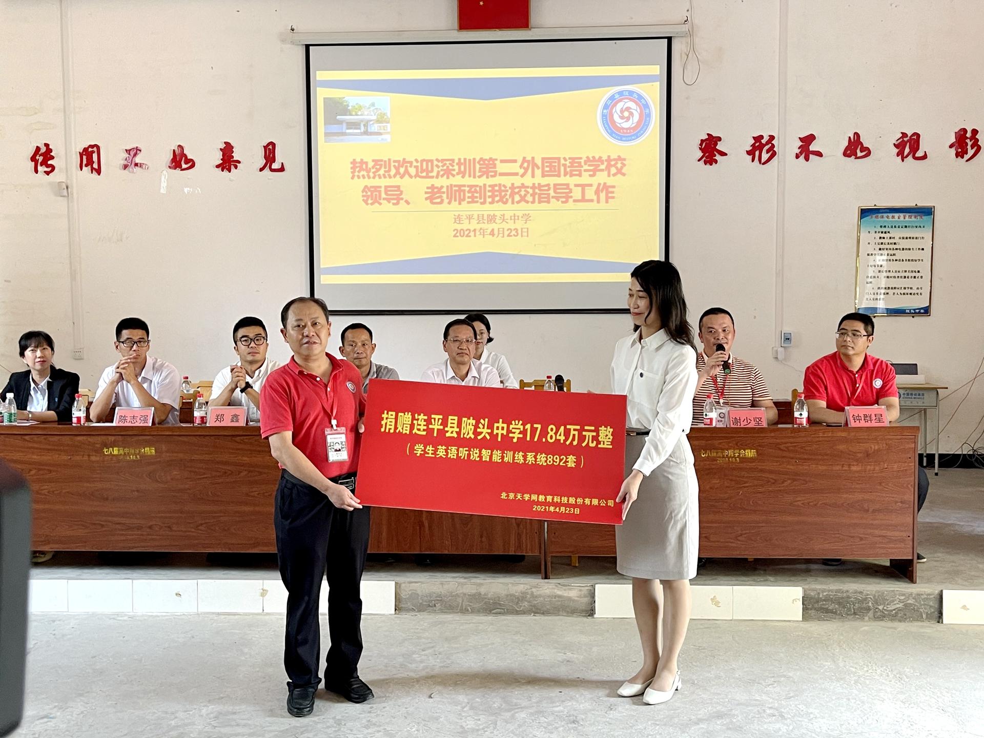 深圳第二外国语学校向陂头中学捐赠了一批爱心体育器材用品,并转交了北京市爱心企业委托其捐赠给陂头中学的价值17.84万元的学生英语听说智能训练系统892套。