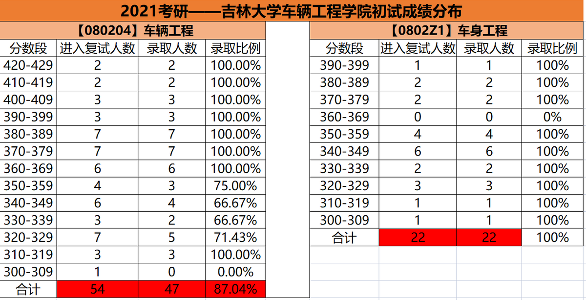 吉大的车辆工程350分就有大概率录取,车身工程报名人数少,21年进入复试的全部被录取。专硕考到355录取概率较大,为求稳建议考到360。