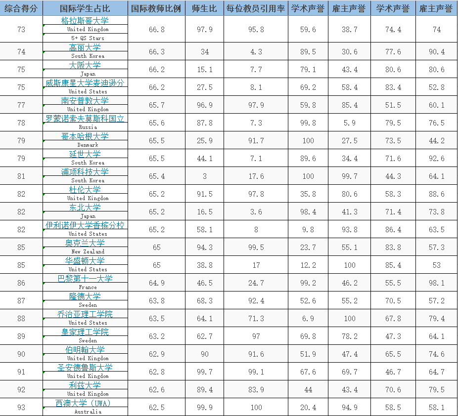 QS世界大学排名按照以下六个指标进行大学评估:1. 学术声誉2. 雇主声誉3. 师生比4. 每名教师的引用率5. 国际教师比例6. 留学生比例