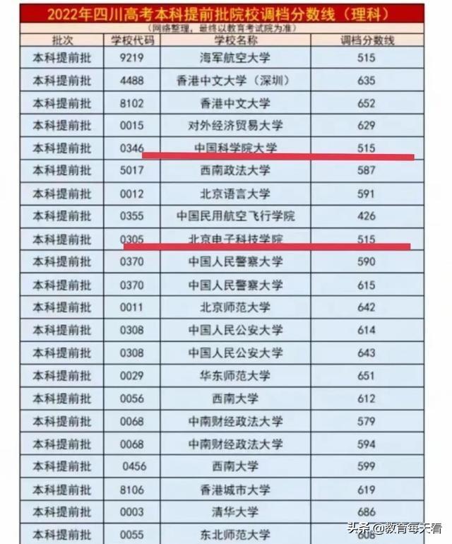 下面这张,就是部分大学在四川省提前批次的调档分数线情况,在图表上能清楚看到,多所好大学招生爆冷,其中最严重的还是当属中国科学院大学和北京电子科技学院。