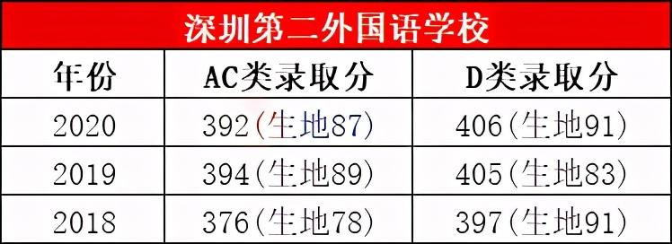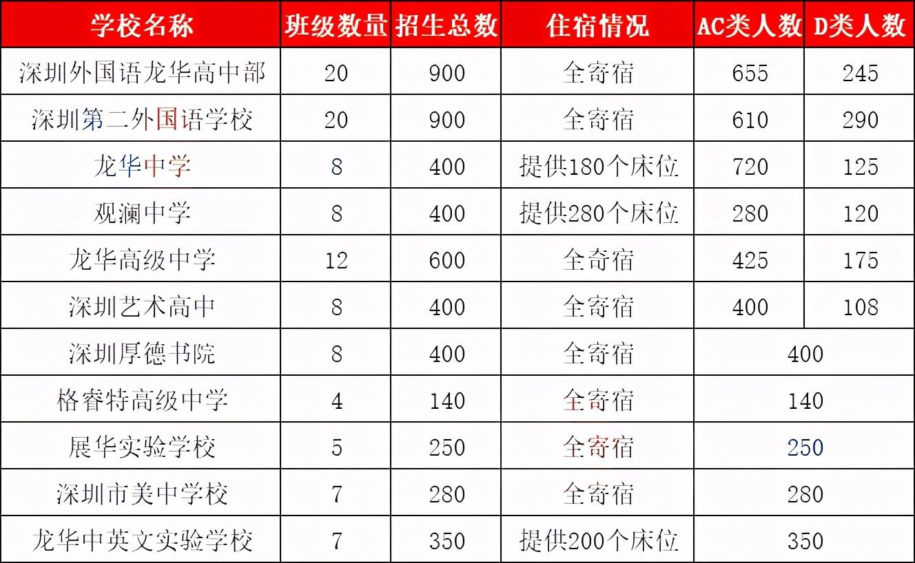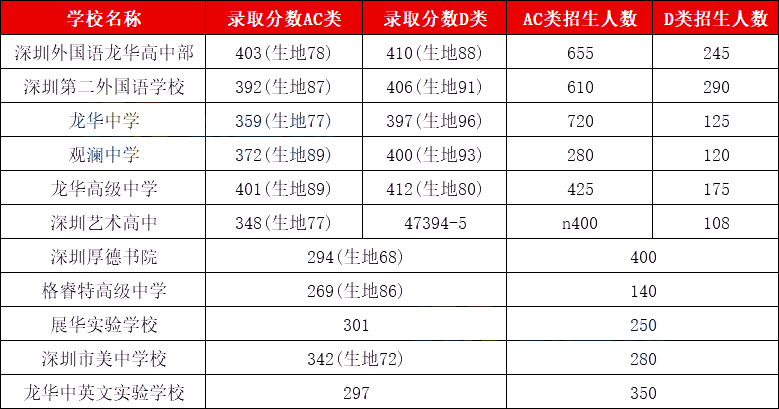 2020年龙华录取分数线最高的学校是深外龙华高中部,AC类403分,D类410分,其次是龙华高级中学,AC类401分,D类412分,其他学校分数线在400分以下。