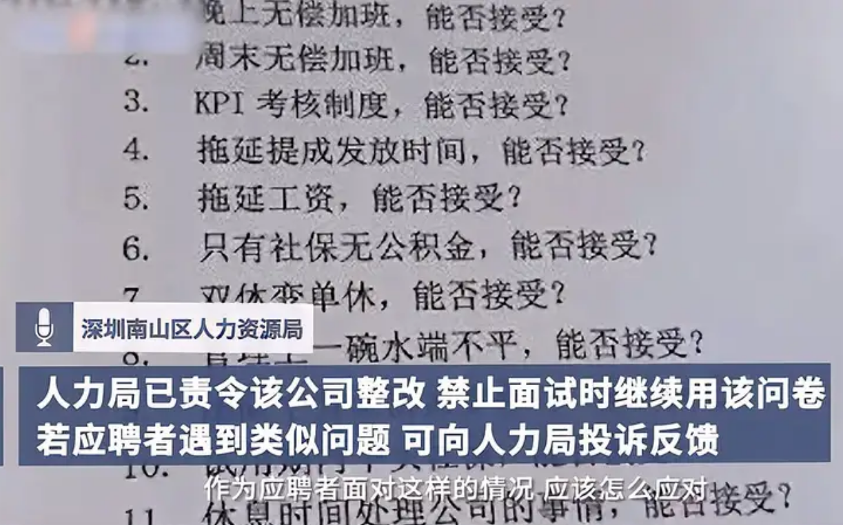 面对这种情况,深圳地区的人力局马上前往该公司进行调查。发现确有此事,问卷是最近发放的,人力局责令该公司马上整改,并且不许再在面试过程中询问这类问题。如果学生们在面试的过程中遇到这类问卷,可以马上到人力局进行投诉。