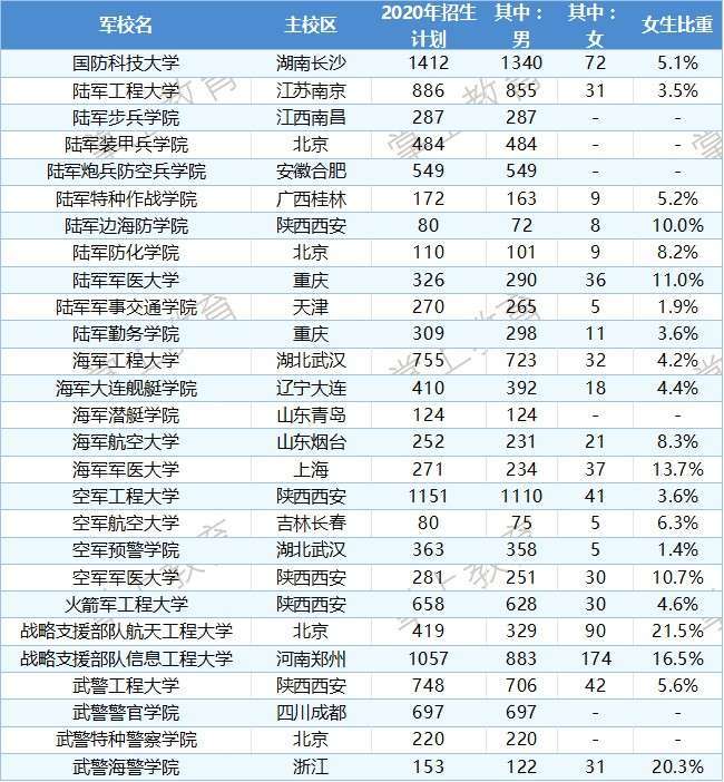 女生招生人数最多的军校是位于河南的信息工程大学,2020年计划招收174名女生,占总招生人数的16.5%,而女生招生比例最高的军校是航天工程大学和武警海警学院,女生招生比重均高于20%,所以女生想要报考军校的话,可以考虑以下这些大学,报考难度可能会相对小一点。