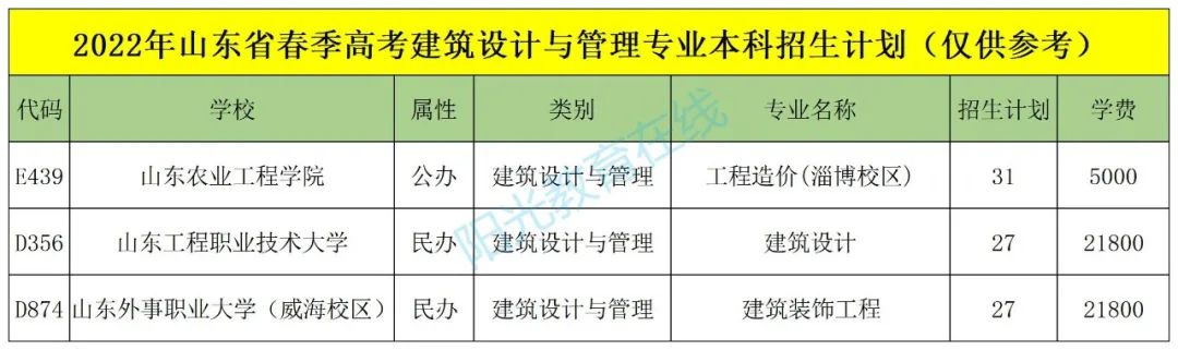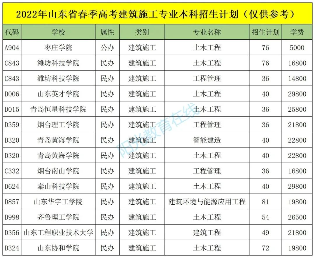 2023年春考类别标准将建筑施工专业与建筑设计与管理合并为建筑类,招生院校中民办院校居多,公办院校仅有山东农业工程学院和枣庄学院。