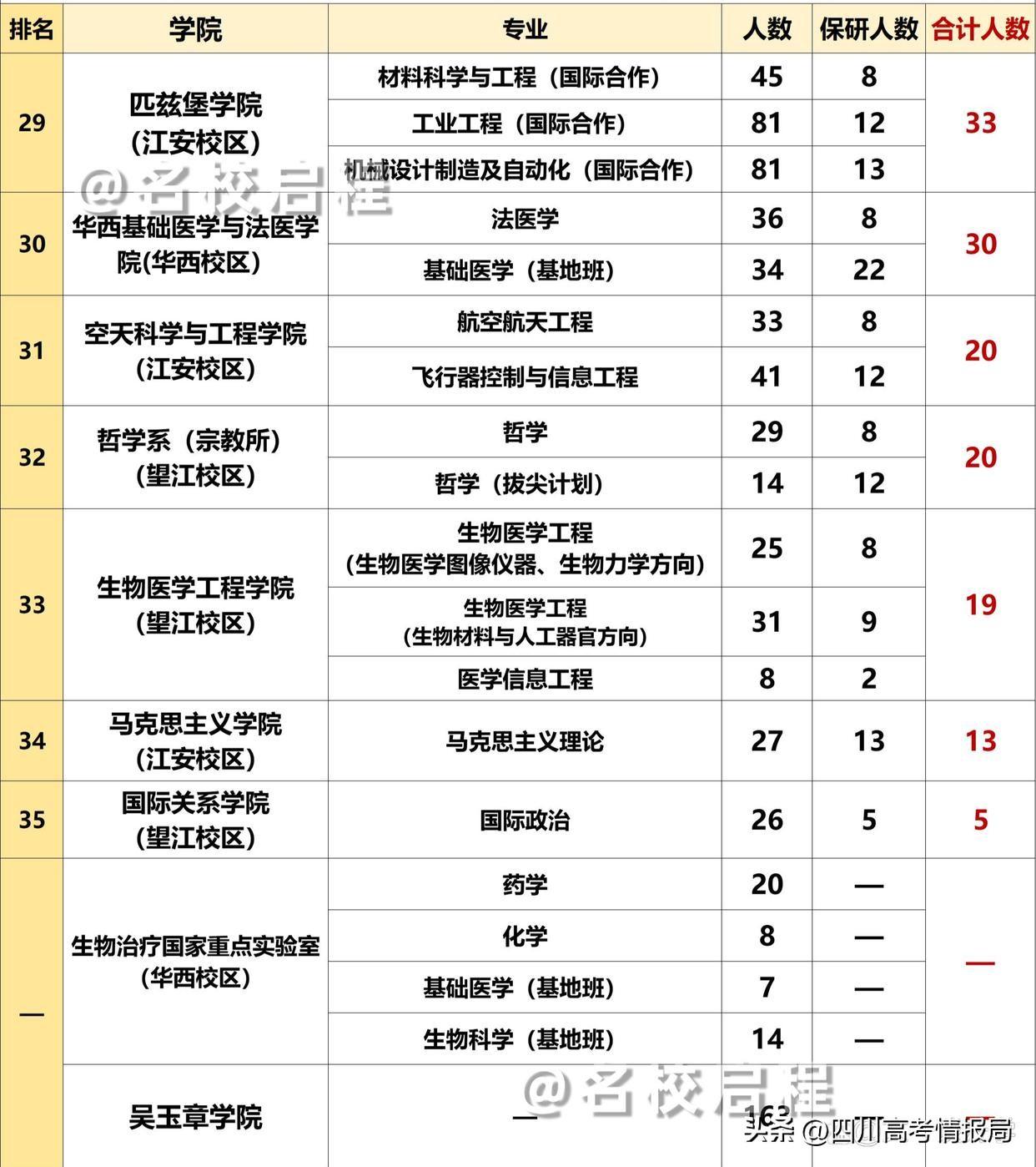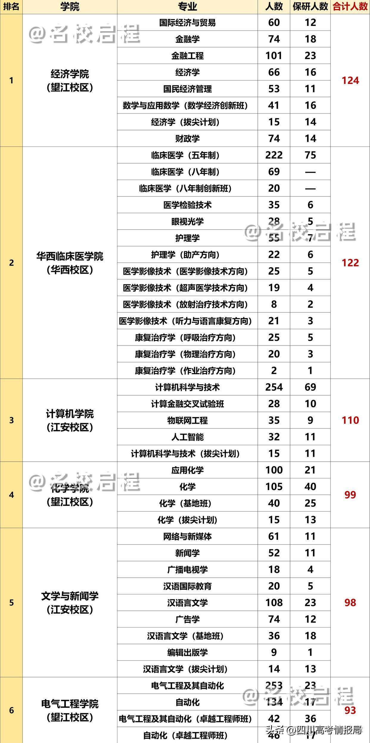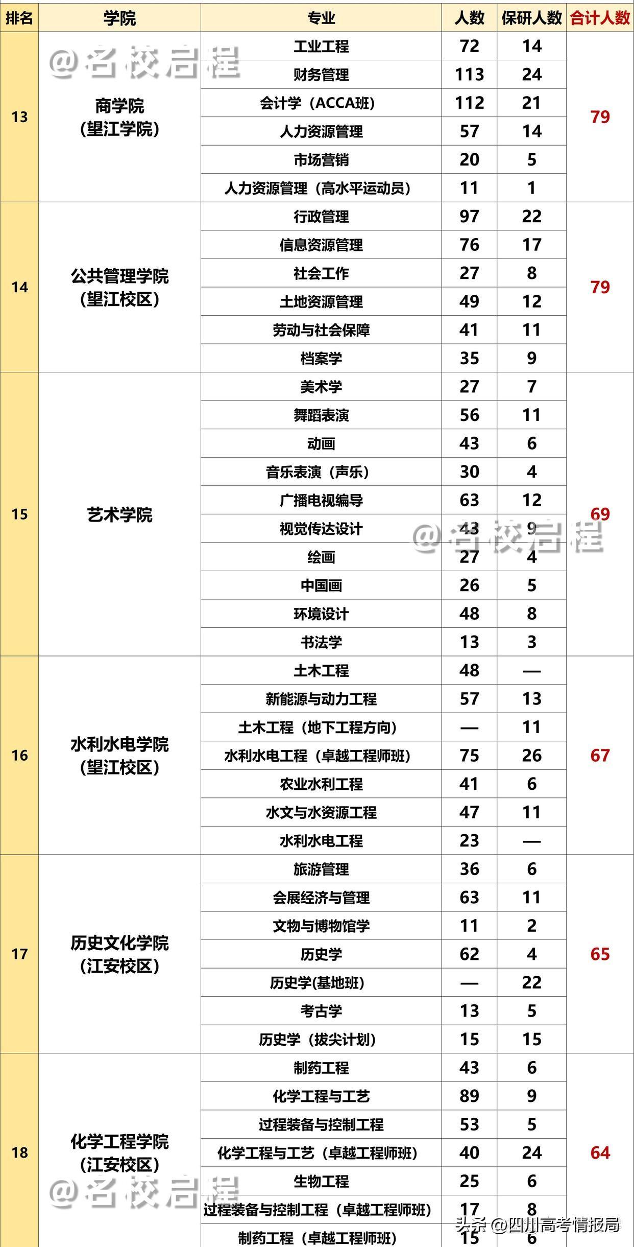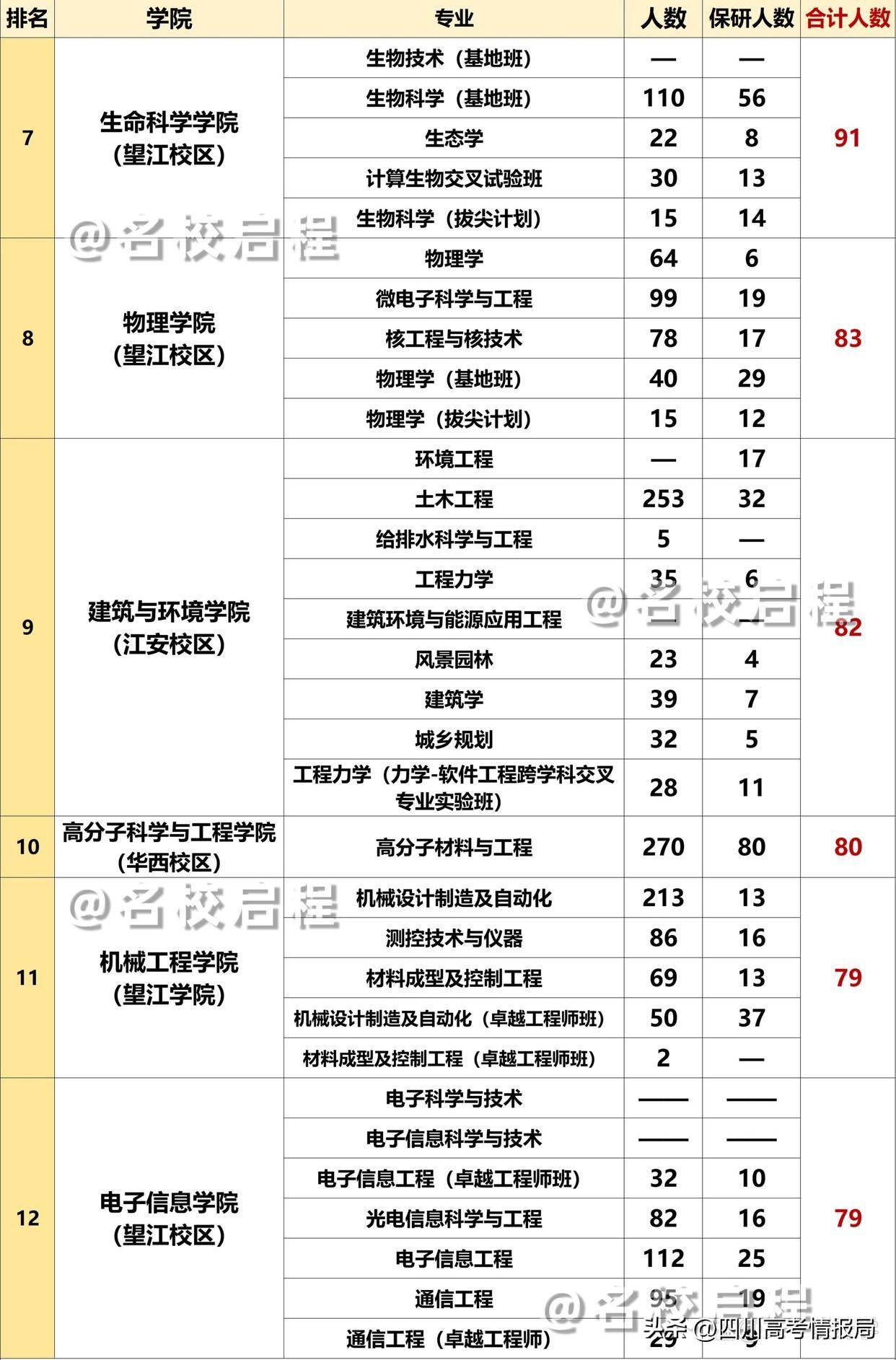 以上是四川大学2023届各专业拟推免情况。保研人数最多的专业是高分子材料与工程共计80人;保研人数最多的学院是经济学院124人,其次是华西临床医学院122;除此以外,学校的拔尖计划、基地班、吴玉章学院等特殊类型,保研率都是想当高的,甚至可达100%:例如历史学(拔尖计划)班,共15人则保研15人……所以,想考四川大学的考生,进校后要抓住二次选拔的机会!