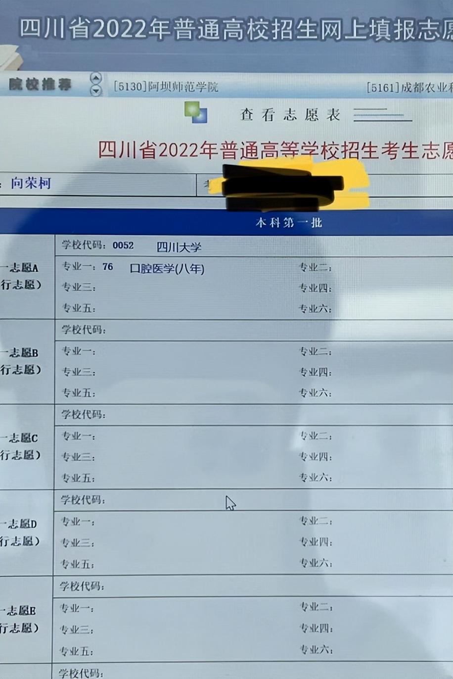 报考四川大学口腔医学专业(八年制),是向荣柯上高一时就确定的目标。所以今年填报志愿的时候,向荣柯也只填报了这一个志愿。