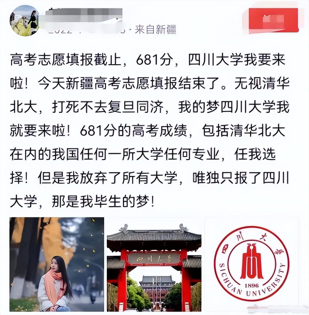 新疆一名女生高考成绩681分,放弃清华北大,选择了四川大学。