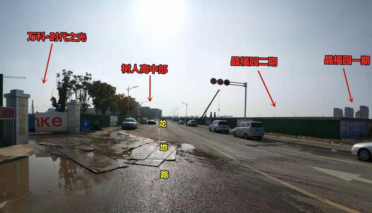 玖龙湖医养健康城对面,龙地路两边,东侧是万科·时代之光和已经建成的树人高中新校区,西侧是已交付的晶福园一期和刚刚动工的二期。