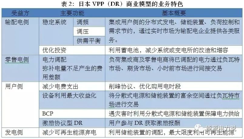 日本推广VPP(DR)的重点集中在住宅、办公大楼、工厂、商业设施、公共事业和电动汽车等六大领域,以“光伏+储能”为主要形式,如下图:列举了日本VPP(DR)商业模式的主要业务特色。