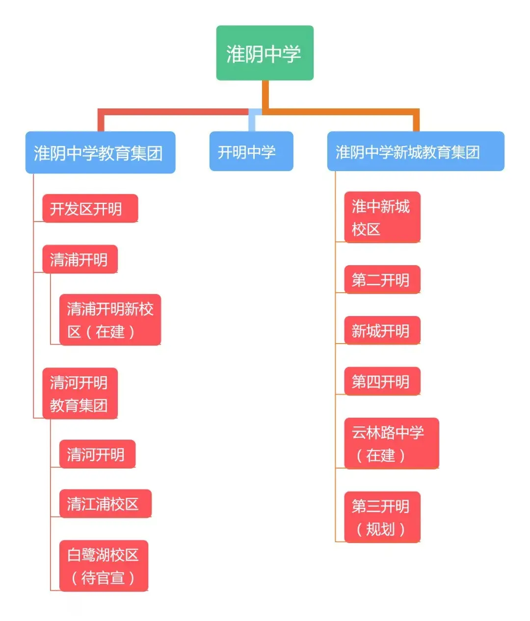 这是淮阴中学各分校的关系图谱,现在由开明分校领衔的集团校有: