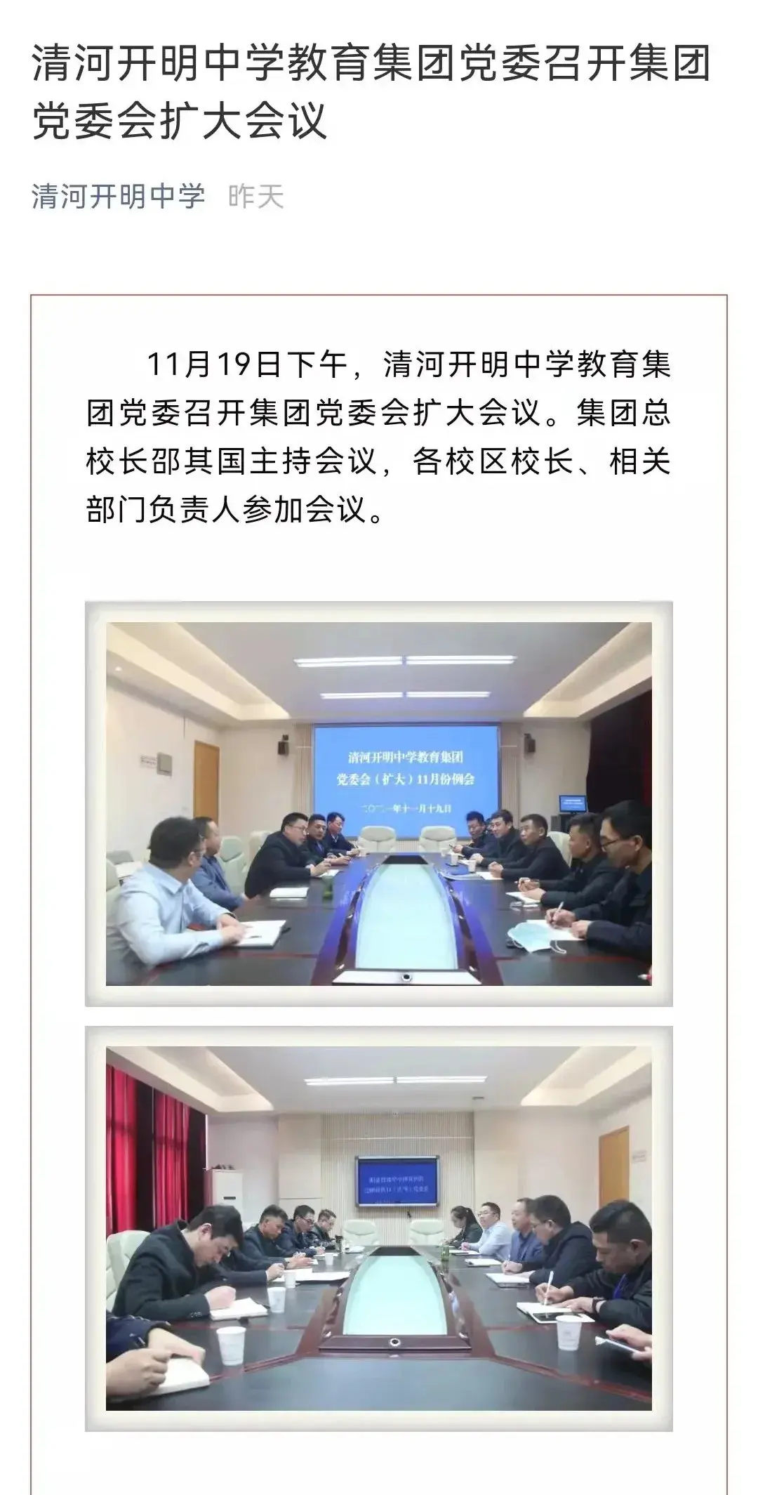 19日清河开明教育集团党委扩大会议,总校长邵其国主持,邵校长曾经担任清江浦中学校长。