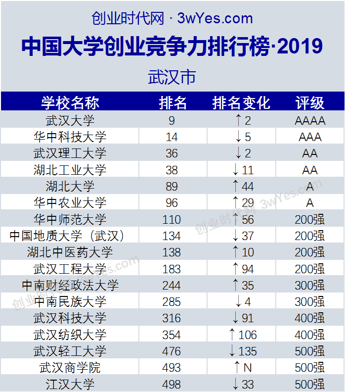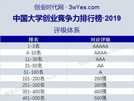 本次榜单在进行评分及排名的基础上,对大学创业竞争力排名及各一级指标进行评级。