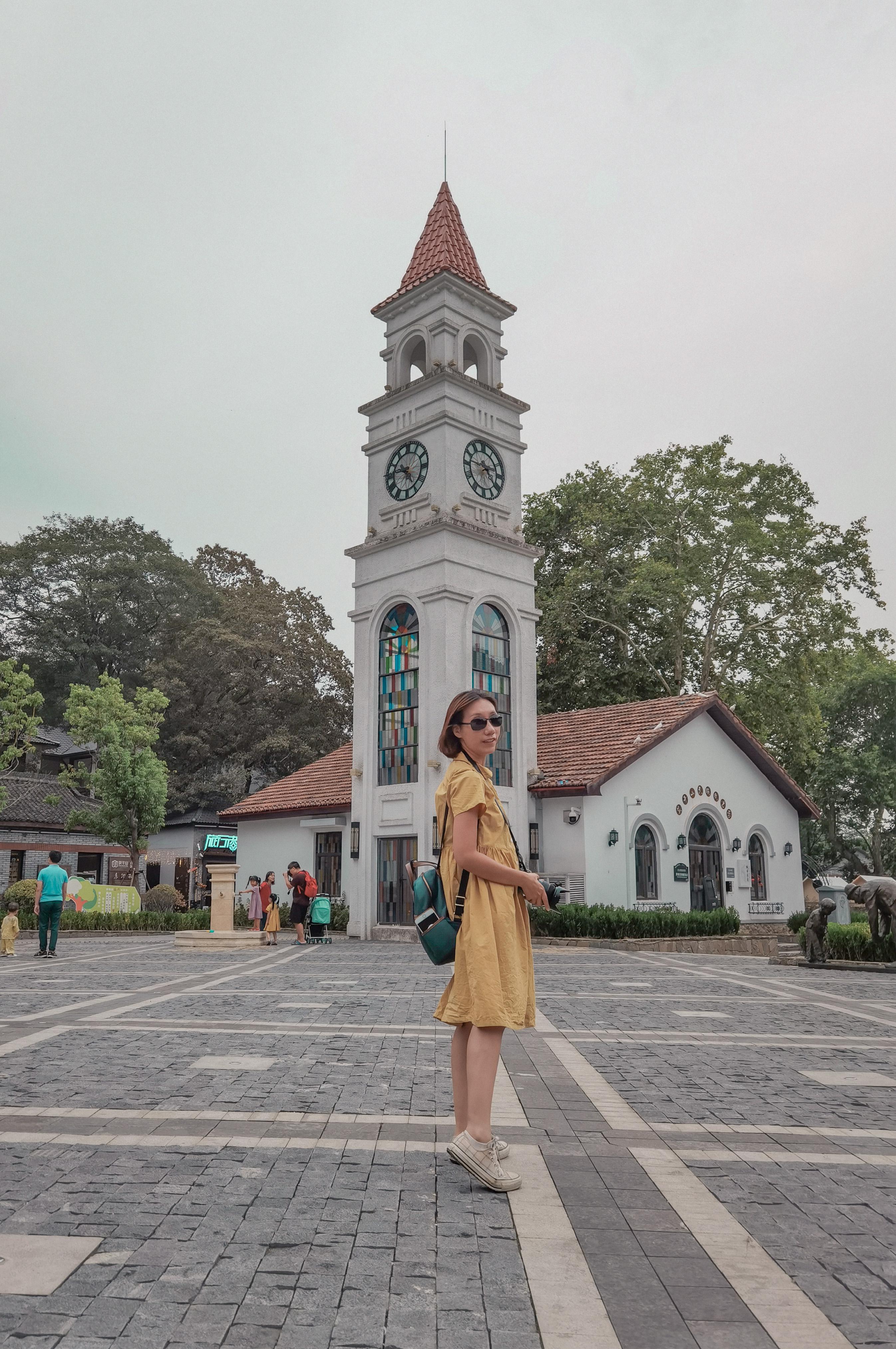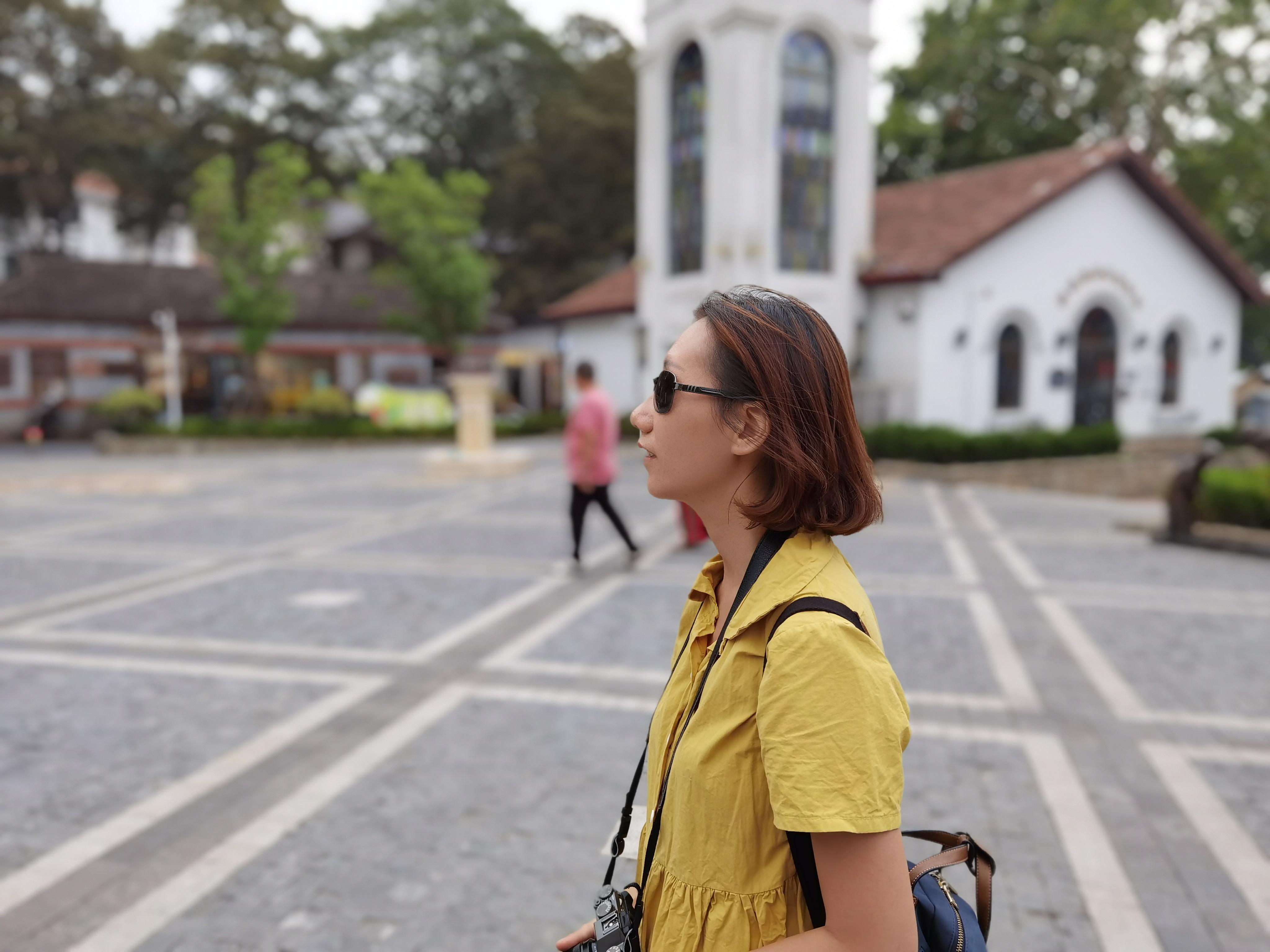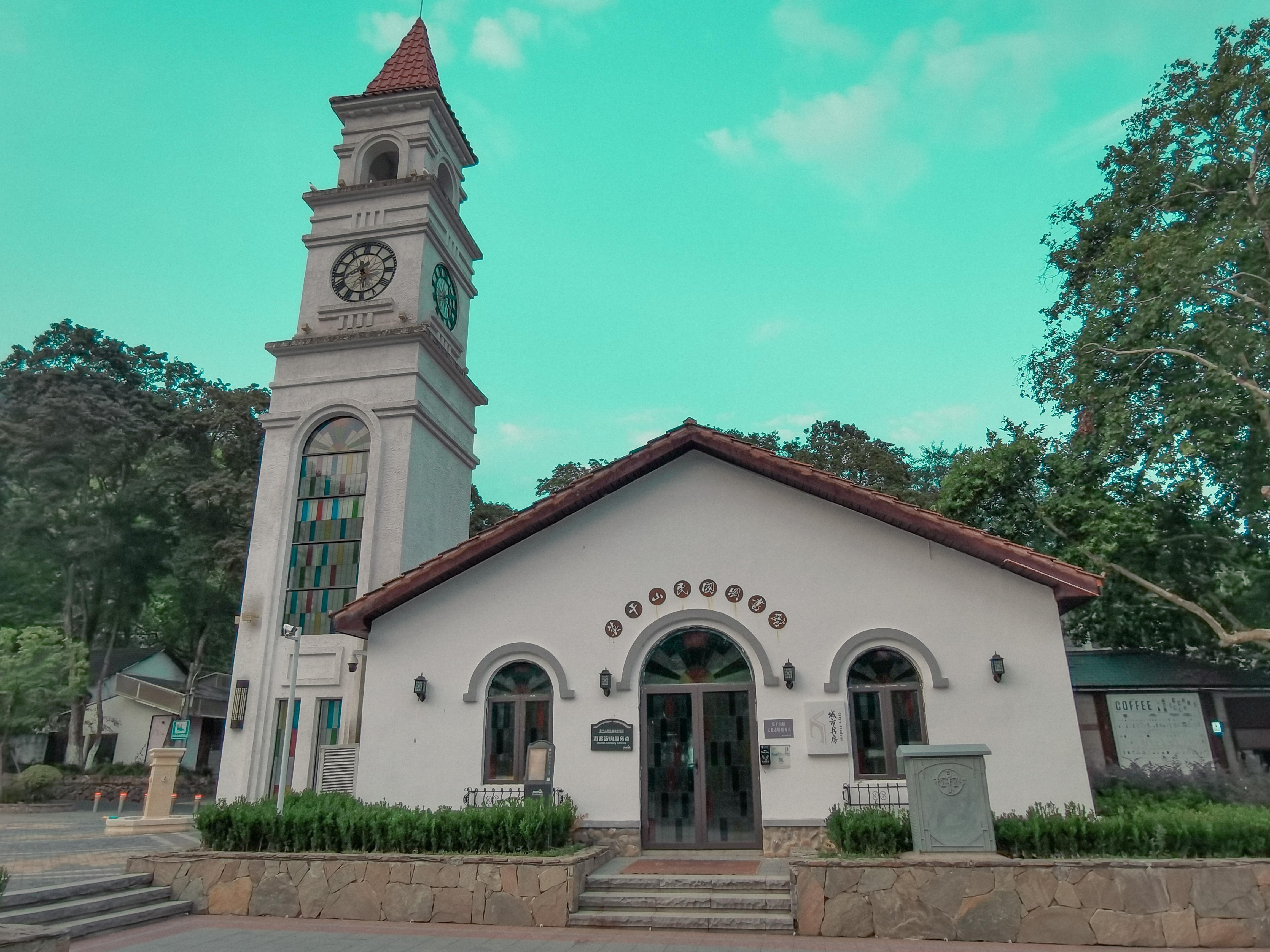 在庾村文化广场上有一座非常显眼的建筑物,酷似教堂的外表,白墙琉璃瓦配上五彩玻璃窗户,这就是民国图书馆,图书馆旁边有座钟楼,整点的钟声响彻这个村落,广场上的白鸽在塔尖盘旋飞翔,让人忍不住想要靠近。