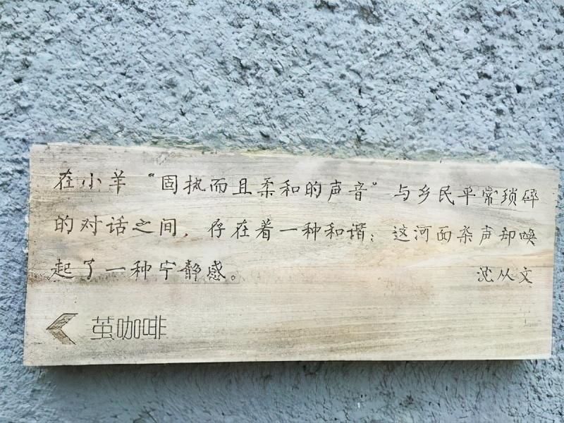 走进文创园,我能感受到被旧时光包围的氛围,同时又能呼吸到时代的清新。在墙上一块原木上,刻着沈从文先生的一行文字,“在小羊固执而且柔和的声音与乡民平常琐碎的对话之间,存在着一种和谐,这河面杂声却唤起了一种宁静感”,虽然沈先生与此地并没有什么瓜葛,但此时此景,这些文字却非常应景,甚是适宜。