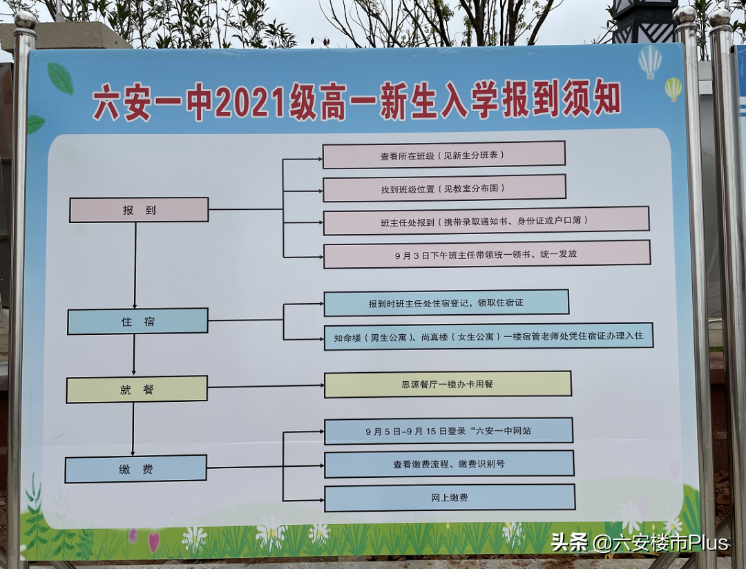 本次高一新生全部在位于枫林路上的南大门登记报到,我在学校门口看到,疫情防控工作到位,学生需填写《六安一中新冠肺炎疫情防控学生健康档案》,并通过测温通道进入校园,各项工作有条不紊地开展,六安一中迎来了全新的开始!
