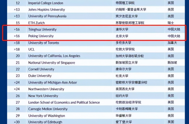 而在这份排名当中,前15名并没有出现清北的影子,反而是两所高校并排排在了第16位。虽然作为国内顶级高校,但相比较其他国外知名院校来说,仍然存在很大的差距。
