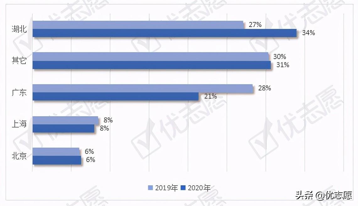 近年来,有大量的湖北高校毕业生前往广东就业,2020年前往广东就业的华科毕业生大幅减少。华为是华科毕业生前往广东就业的重点企业,2020年前往华为的华科本科毕业生人数较上一年度下降50%。2020年广东对华科毕业生的吸引力有所减弱。