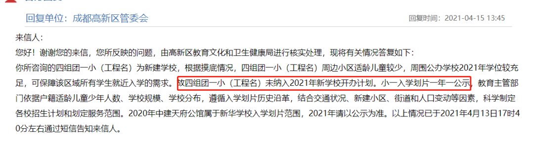 该校已于去年修建完毕,但是却未招生,据成都高新区管委会,由于周边小区适龄儿童较少,周围公办学校2021年学位较充足,可保障该区域所有学生就近入学的需求。故四组团一小(工程名)未纳入2021年新学校开办计划,学校预计2022年9月正式开学。