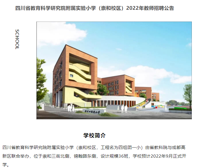 从省教科院附属实验小学官微发布的一则招聘公告来看,省教科院附属实验小学(崇和校区)工程名为四组团一小,也就是当初所说的省教科院附属小学东区,由省教科院与成都高新区联合举办,位于崇和三街北侧,锦翰路东侧,设计规模36班。