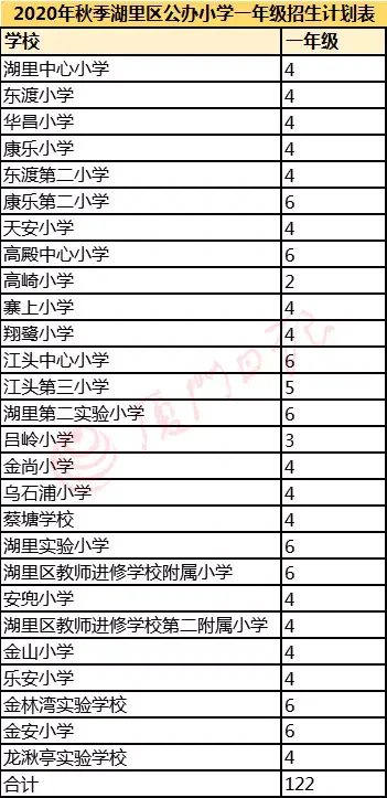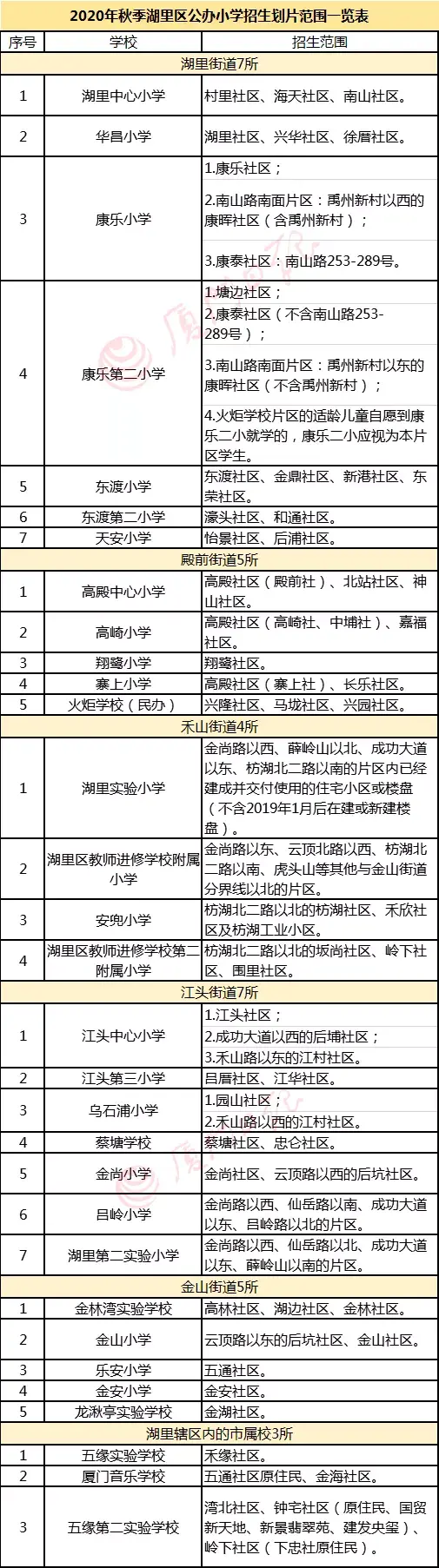 实行划片招生,优先招收片区内户籍适龄儿童。2020年秋季湖里区公办小学招生划片范围详见最开始的表格。
