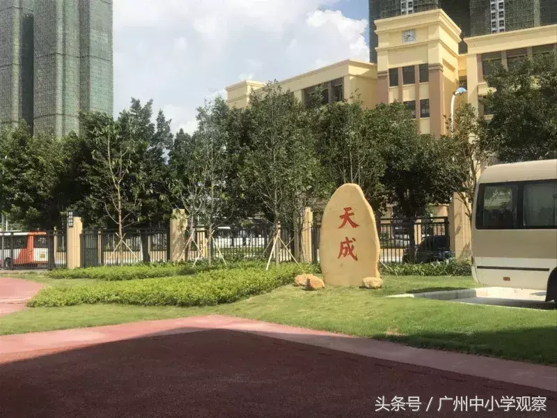 天成中学占地面积23837平方米,校园布局时尚大气,硬件均是按照省一级学校的标准配置的。从校门外往里走,进入校门即是石山流水墨池组成的开放式生态植物园,“少年强则国强”的名言赫然高挂在教学楼上。再往里走,足球场,游泳池,棋艺室,体艺空间等功能场室配套齐全,网络化教育教学设备先进。“比起我们番禺亚运城校区毫不逊色,远远高于普通初中的标准。”广铁一中天成中学方面介绍。