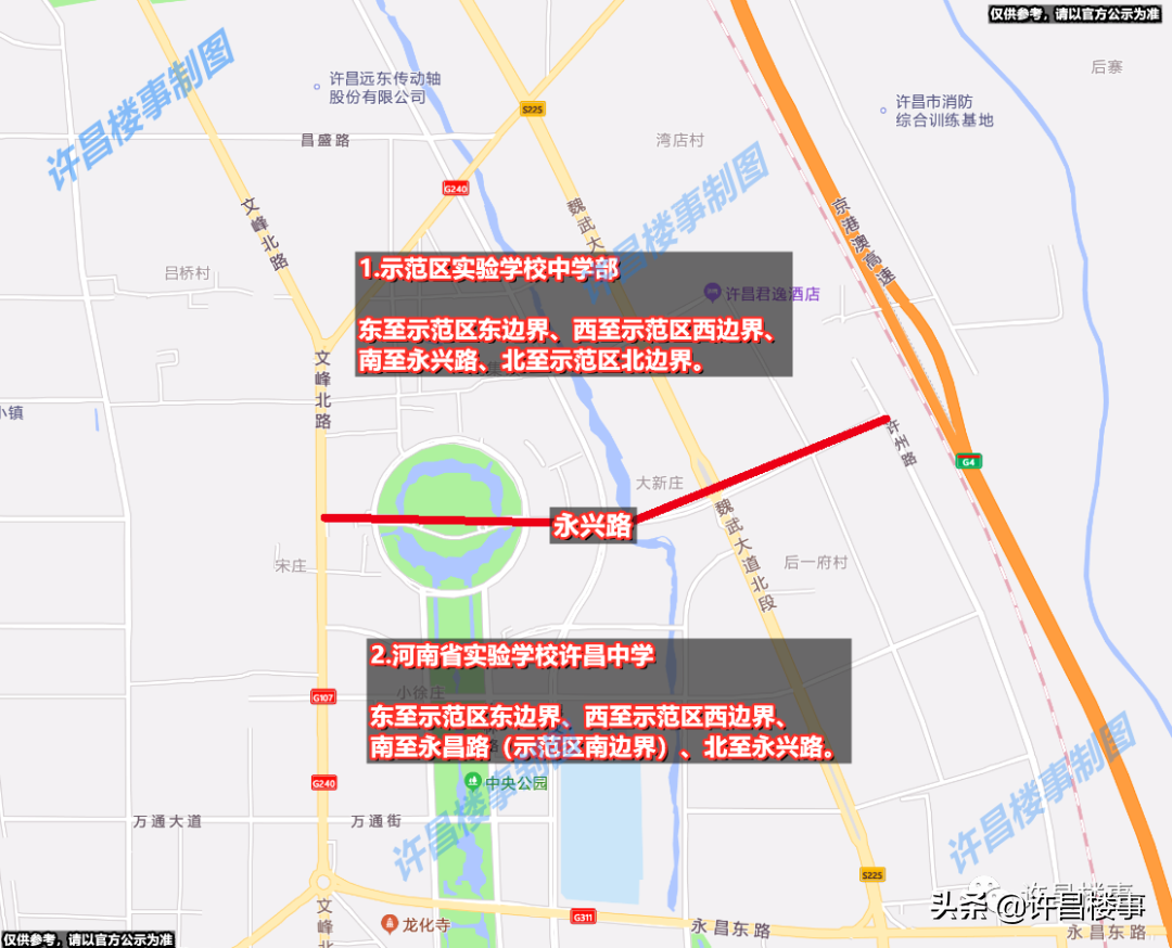 这两所学校的学区范围划分,也比较简单,大致是以永兴路为界南北划分,北侧为示范区实验学区,南侧为省实验许昌中学学区。