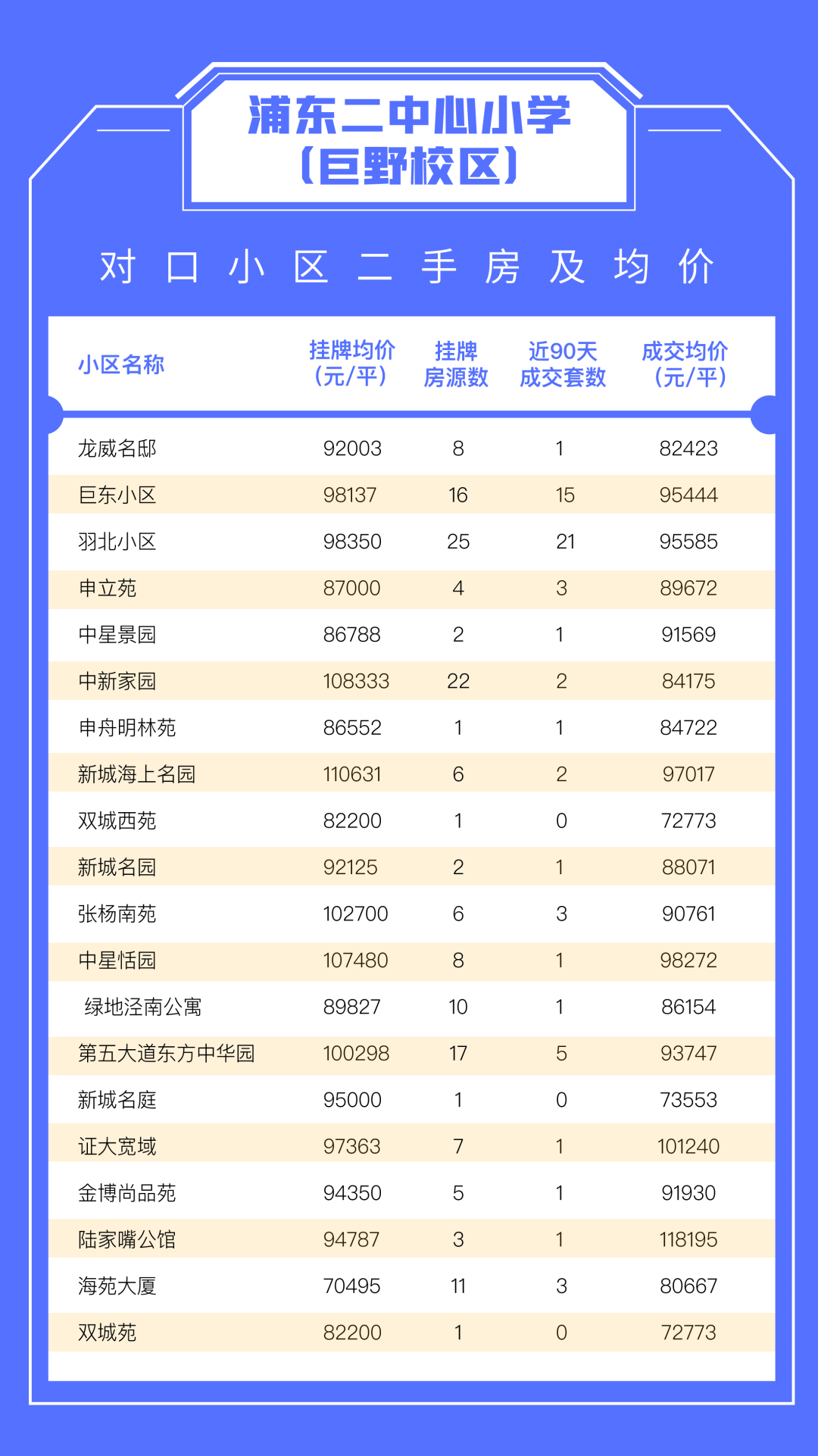 在浦东二中心小学的对口范围内,小胖君挑选出部分目前有挂牌的小区,列出周边小区挂牌房源数量、挂牌价格、近90天内交易量以及成交价格。