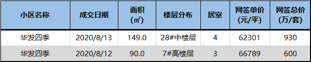 根据数据显示,华发四季目前挂牌房源共11套,挂牌均价约为84700元/平;近90天内共成交2套,以3居室、4居室为主,成交均价约为89914元/平。