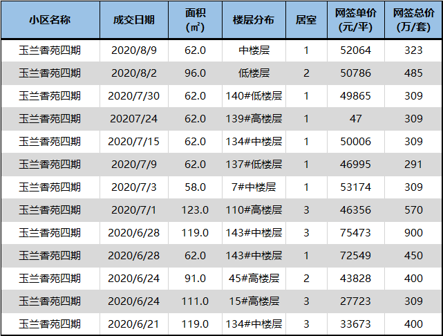 根据数据显示,玉兰香苑四期目前挂牌房源共46套,挂牌均价约为52058元/平;近90天内共成交13套,以1居室、3居室为主,成交均价约为56099元/平。