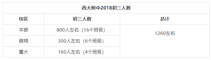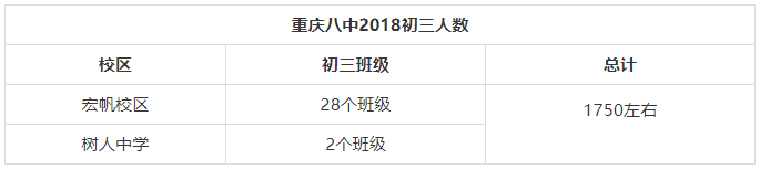重庆八中初中有两个校区,两个校区拉通排名,2016年初三人数1800人左右,2017年初三人数1752人左右,2018年初三1750人左右。
