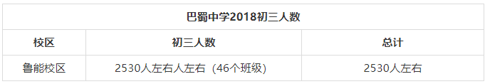巴蜀校区主要在鲁能校区,2016年初三人数3200人左右,2017年初三人数3000人左右,2018年初三2530人左右。