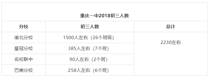 重庆一中初中部有很多个校区,2016年初三一共2300人左右,2017年2500人左右,2018年2230人左右,每年的人数都在2300-2500左右。