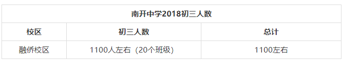 南开中学初中部校区在融侨校区,2016年初三1200人左右,2017年初三1100人左右,2018年1100人左右。每年人数都在1100人左右,大概20个班。
