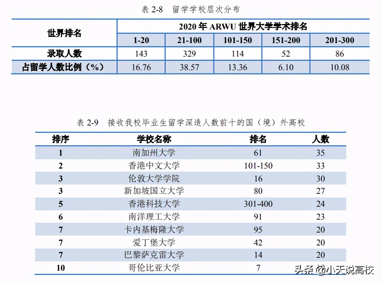 华中科技大学2020年本科生出国853人(12.3%),出国就读院校全球前100名高校学生472人。华科出国率比武大稍低,但出国院校前100名的,武大有676人,这个指标比华科要高得多。