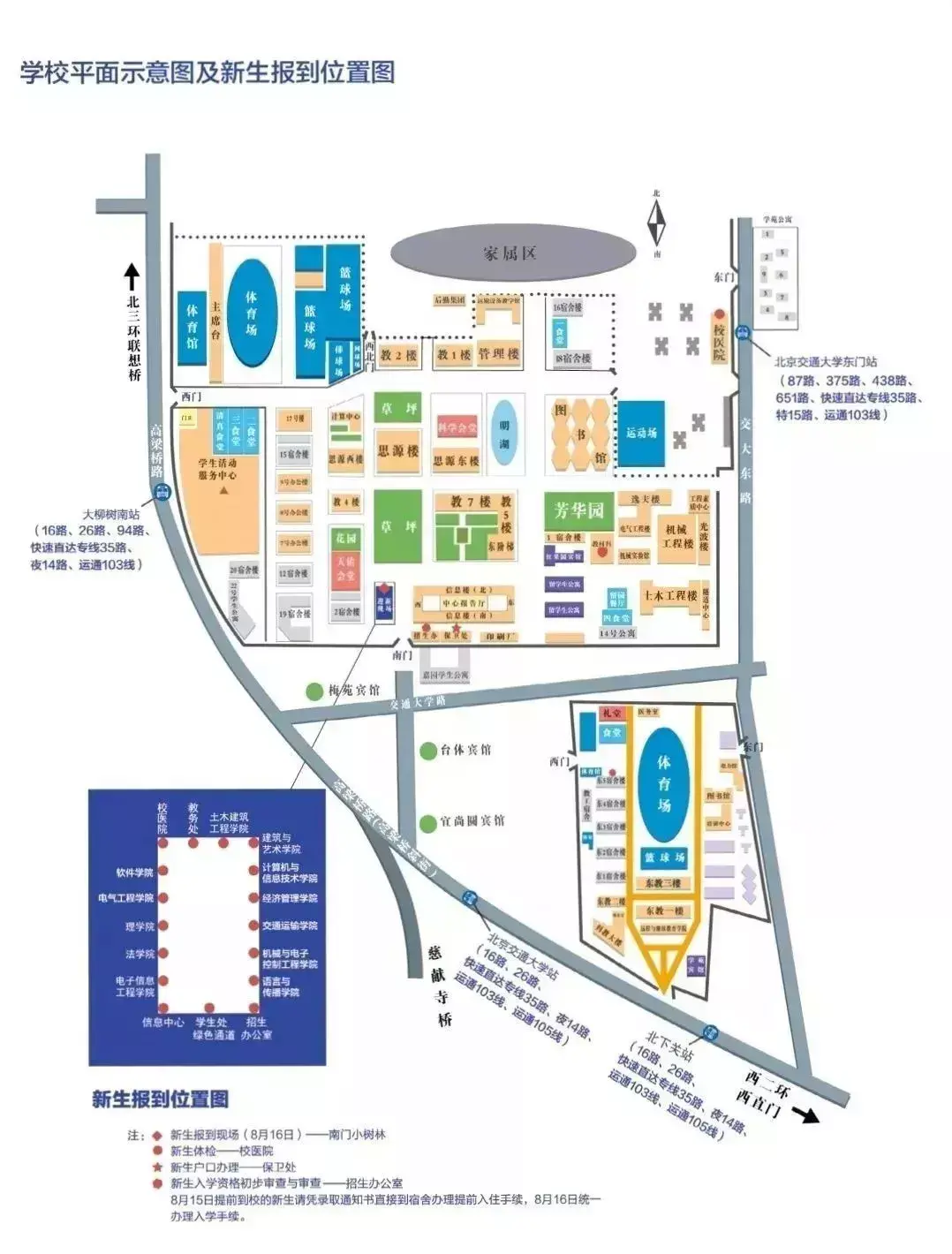 报道当天在北京西站出站口附近设有新生接待处,并安排校车在6:00-20:00期间接站;北京站和北京南站周边大型车无法停靠因此无法接站,请参考《新生必读》和上述信息自行到站。