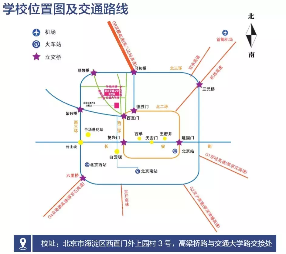 北京南站乘坐地铁 4 号线到西直门站下车,出地铁 A 口,换乘 16 路公交车(或 26 路、运通 105 路)到北京交通大学站下车。