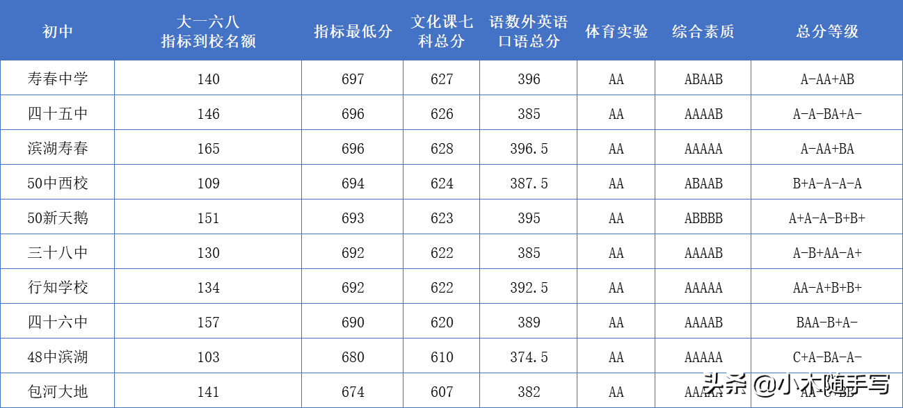 除了四十八中滨湖和包河大地,其他学校大一六八指标到校最低分都在690分以上。