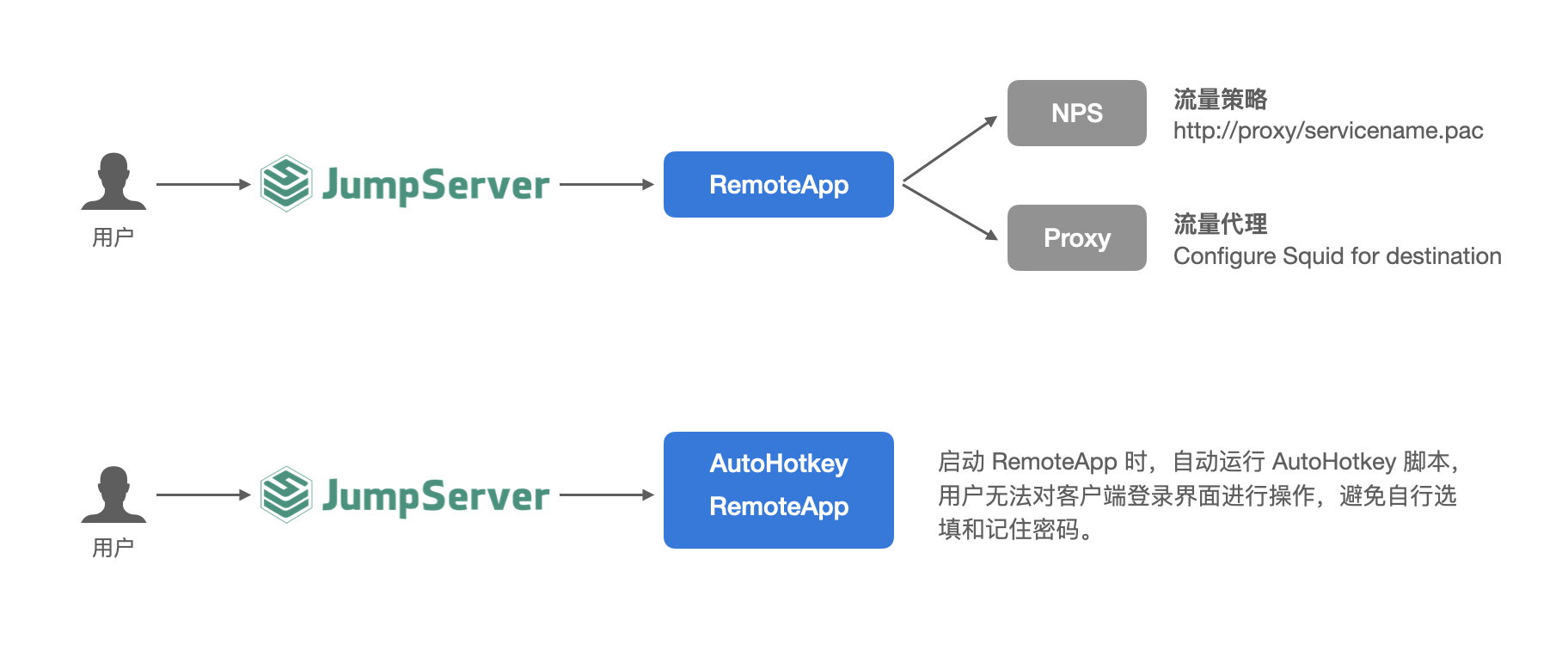 我们通过设置Proxy代理服务器来限制RemoteApp访问的运维对象和运维端口,以确保用户在通过JumpServer启用RemoteApp访问的位置都在管理员的控制之下。我们还设置了一套脚本机制,也就是流量控制策略,控制用户只能访问某个目的IP和端口,也在很大程度上提高了系统访问的安全性。