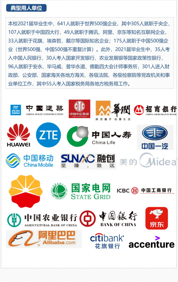 毕业生具体的就职单位主要有:中国人民银行,中国农业银行,招商银行,中信银行,滴滴,华为等企业。