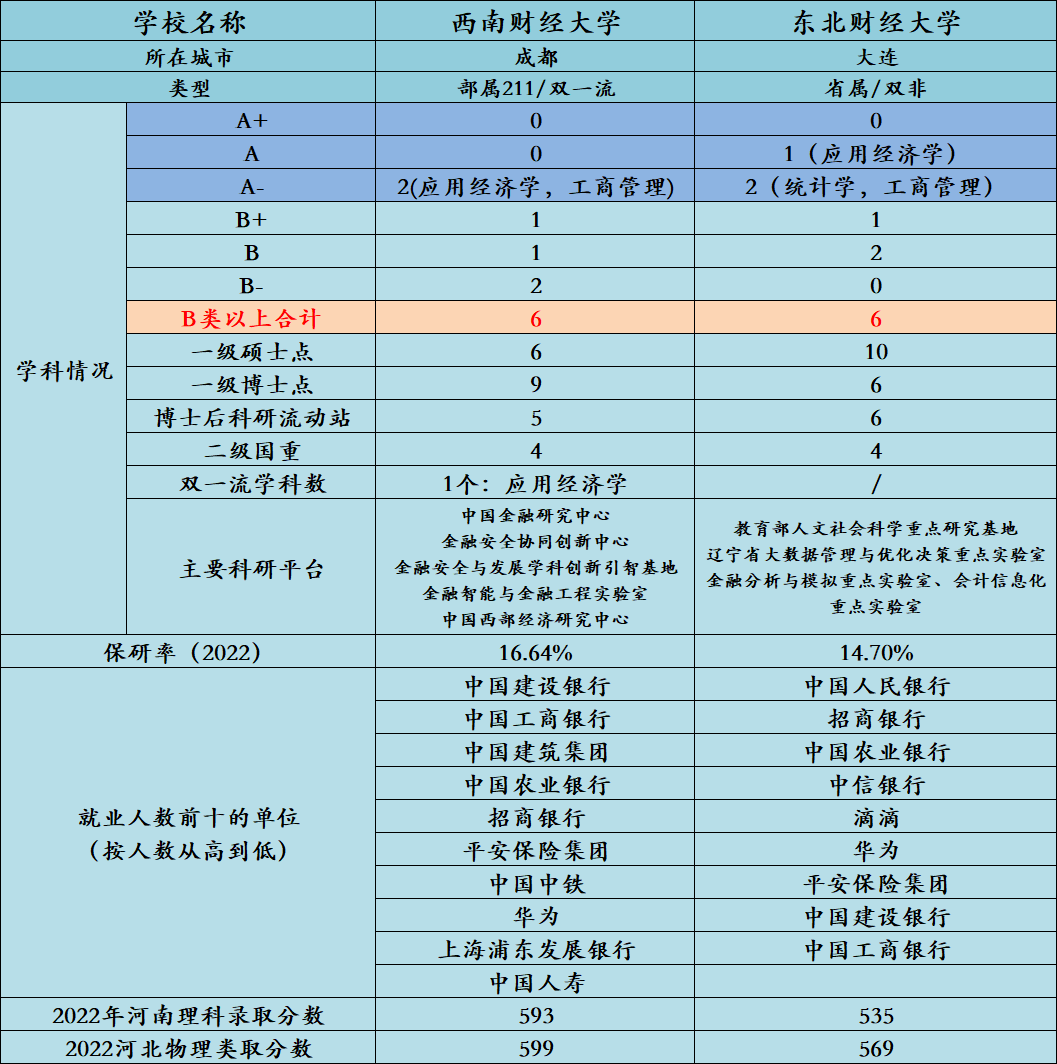 从两所高校的综合对比来看,在学校定位、录取分和保研率方面,无疑是西南财经更高,而且是远远超过;而在学科实力上,根据第四轮学科评估的结果,东北财经作为一所双非高校,却能称得上是完胜西南财经;而在就业领域,就业方向和就业单位基本在同一层次。